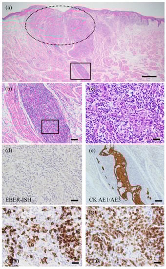 - Shimizu, S.; Miyazaki, A.; Nakamori, K.; Nakai, H.; Ogi, K.; Hasegawa, T.; Hiratsuka, H. Immunophenotypic analysis of tumor infiltrating lymphocytes in Epstein-Barr virus-negative lymphoepithelial carcinoma of the oral cavity: Report of a case. J. Oral Maxillofac. Surg. Med. Pathol. 2017, 29, 581–586. [Google Scholar] [CrossRef]