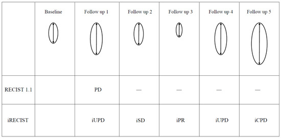 - Seymour, L.; Bogaerts, J.; Perrone, A.; Ford, R.; Schwartz, L.H.; Mandrekar, S.; Lin, N.U.; Litiere, S.; Dancey, J.; Chen, A.; et al. iRECIST: Guidelines for response criteria for use in trials testing immunotherapeutics. Lancet Oncol. 2017, 18, e143–e152. [Google Scholar] [CrossRef]