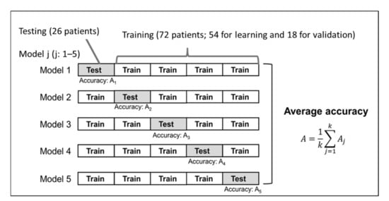 Among image features created by the radiomics technique, we selected the optimal features for machine learning using the least absolute shrinkage and selection operator (LASSO) logistic regression analysis with MATLAB code [21,22]. Furthermore, we used a machine learning method to construct predictive models, employing a neural network classifier with 10 hidden layers and rectified linear unit activation. The selected radiomics features were used as input values, and the information of “pCR” or “non-pCR” was used as output values. Here, 98 patients were randomly divided into a training group (72 patients; 54 for learning and 18 for validation) and a testing group (26 patients). To find the best predictive models, we used the 5-fold cross-validation method (Figure 2). The training–validation–testing processes were repeated five times for each patient group. The results of the prediction for the training and testing groups were evaluated in terms of accuracy, sensitivity, and specificity. Their predictive performance was evaluated using the area under the receiver operating characteristic (ROC) curve (AUC) score.