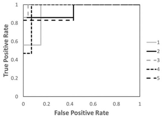 The area under the receiver operator characteristic curve (AUC) of five prediction models constructed by 5-fold cross-validation method. AUC scores for the models 1–5 were 0.93, 0.94, 0.99, 0.92, and 0.92, respectively.