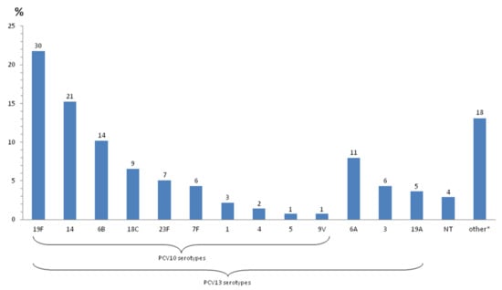 Serotype distribution of invasive pneumococcal isolates. Serotype distributions of invasive pneumococcal isolates are presented by a declining frequency of PCV10 serotypes and PCV13 serotypes (numbers of isolates for each serotype are presented above the bars). Other serotypes (*) refer to serotypes 23A (N = 3), 33F (N = 3), 9A (N = 2), 10A (N = 2), 9N (N = 1), 11A (N = 1), 12F (N = 1), 15B (N = 1), 15C (N = 1), 15F (N = 1), 17F (N = 1), and 22F (N = 1).
