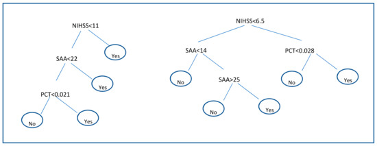 Decision trees applied on the discovery subgroup (left Decision tree) and the Decision Tree applied on the validation subgroup using only biomarkers: SAA and PCT and NIHSS shown on the right.