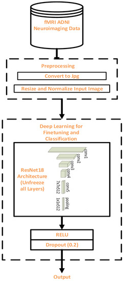 The research methodology includes data collection, pre-processing, DL-based finetuning and classification, as well as evaluation. A well-known AD database provided the fMRI data. Figure 1 shows the flow diagram of the proposed model.
