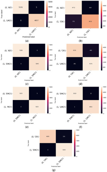 Confusion matrix of the proposed model for binary classification: (a) LMCI vs. AD; (b) CN vs. AD; (c), AD vs. EMCI (d), CN vs. LMCI (e), EMCI vs. MCI (f), EMCI vs. LMCI (g), CN vs. EMCI.