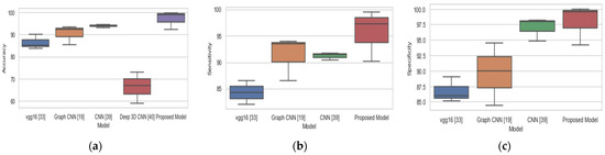 The study [23] achieved 93.46%, 94.03%, and 92.50% in terms of accuracy, sensitivity, and specificity respectively for CN vs. LMCI binary classification and thereby outperformed our proposed method in terms of accuracy and sensitivity. Likewise, the study [39] outperformed our proposed model in all the three-performance metrics for CN vs LMCI. The overall performance of our proposed model on the three binary classification tasks is based on accuracy, sensitivity, and specificity, and this is compared with existing methods as represented with box plots in Figure 4. Our proposed model achieved the best performance with a median accuracy of 98.9%, median sensitivity of 98%, and median specificity of 99.9% over three binary classification tasks. Our proposed model achieved the highest accuracy, sensitivity, and specificity of 98.74%, 97.24%, and 100%, respectively, for CN vs EMCI binary classification as compared to other existing methods. In LMCI vs EMCI binary classification, our proposed method achieved a highest accuracy, sensitivity, and specificity of 99.76%, 99.56%, and 99.97%, respectively. By comparing the findings of this study to the findings of other research, we may conclude that our proposed system is a more trustworthy and accurate method.
