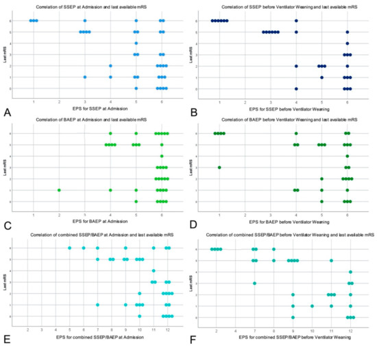 Figure 3. Provides visualization of last available mRS distribution in dependence of separated and combined SSEP and BAEP course, respectively. In detail, correlations of last available mRS and SSEP/BAEP at admission (A,C) and before respiratory weaning (B,D) are demonstrated by Scatter plots. Additionally, the combined model of SSEP/BAEP correlated with the last available mRS is demonstrated (E,F).