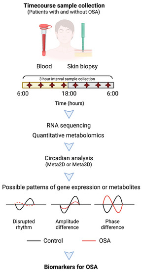 To develop circadian or time-dependent biomarkers for OSA, we recommend conducting time course studies with at least 3 or 4 h interval sample collections of blood or skin for a period of 24 h from patients with and without OSA. For a comprehensive study design, guidelines for the use of circadian -omics data have already been outlined by experts in the field of circadian biology [116]. Samples from both healthy controls and subjects with OSA should be processed for circadian analysis of both the transcriptome and metabolites. There are multiple ways to measure circadian rhythms with both advantages and disadvantages to these methods [117]. However, this study design would help to understand the alteration of the circadian transcriptome or metabolome among subjects with and without OSA for direct comparison. A systemic alteration of rhythmic genes or metabolites in patients with OSA may serve to identify targets for further diagnostic value (Figure 1).