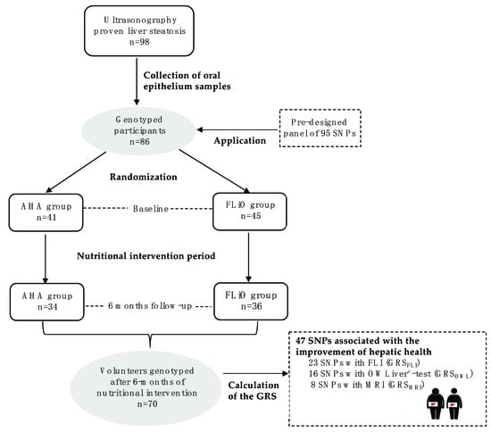 The current randomized controlled trial was designed to compare the effectiveness of two weight loss dietary strategies with different nutritional features, anthropometric measurements, body composition and biochemical markers on hepatic health in overweight or obese subjects with ultrasonography-proven liver steatosis, as described elsewhere [32,33]. The intervention had a duration of 24 months and the participants were randomly assigned to the American Heart Association (AHA) or the Fatty Liver in Obesity (FLiO) group [34]. However, the present study was performed concerning the results after 6 months of follow-up. The study was approved by the Research Ethics Committee of the University of Navarra, Spain on 24 April 2015 (ref. 54/2015) and accessed on www.clinicaltrials.gov (FLiO: Fatty Liver in Obesity study; NCT03183193). Each subject gave written informed consent prior to enrollment in the study. All the procedures were performed in accordance with the Declaration of Helsinki and the study was conducted following the CONSORT 2010 guidelines.