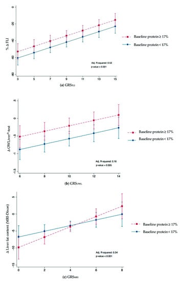 In addition, Figure 2A–C plot simple linear regression analyses of statistically significant predictors of FLI, OWLiver®-test and liver fat content (MRI) decrease by diet. A lower change in FLI and OWLiver®-test was associated with a higher baseline protein intake (p-value: 0.009 and 0.022, respectively). Moreover, this association became more important when the genetic risk was higher (Figure 2A,B). Figure 2C shows that a higher baseline protein was associated with a lower change of liver fat content (by MRI) becoming the effect more evident when the genetic risk was higher (p interaction: 0.017).