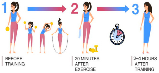 Scheme I is popularly used for assessing the recovery ability of the athlete’s body when leaving the training process. An analysis of the dynamics of body processes, during and after physical activity, is carried out. The nature of the loads is recommended to be cyclical and moderate (same for all examined athletes). Three points-of-time for material sampling against the background of one training process was determined as follows: (1) before training; (2) 20 min after the end of physical exercise; (3) 2–4 h after the end of physical exercise (Figure 1).