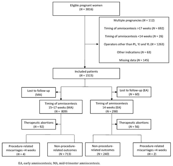 A total of 3824 pregnant women were identified who underwent amniocenteses between 1 January 2007 and 21 November 2018. Of the total, 2309 women were excluded on the basis of the exclusion criteria mentioned in the “Methods” section. (See the trial profile shown in Figure 1.) There were 1515 eligible women. Of this, complete information was known for 1107 (73.1%): 809 (69.9%) in the MA cohort and 298 (83.2%) in the EA cohort. Four hundred eight (26.9%) women were lost to follow-up because the primary outcome was unknown.