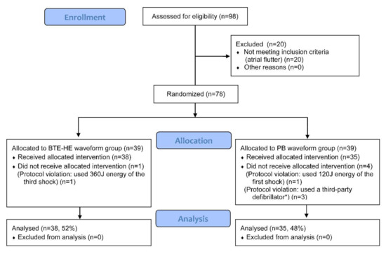 Figure 2. CONSORT flowchart of patient enrollment, allocation and analysis. * The third-party defibrillator was DEFIGARD 4000 (Schiller Médical, Wissembourg, France), embedding the pulsed biphasic technology.