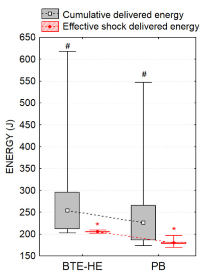 Figure 3. Comparison of BTE-HE and PB waveforms in respect to the delivered energies during CVS: cumulative delivered energy (primary endpoint), delivered energy of the effective shock (secondary endpoint). Plots indicate mean ± 95% CI (box) and min–max range (whiskers). Markers: # p = 0.31—Non-inferiority result was proven for the cumulative delivered energies; * p < 0.001—Significantly lower delivered energy of the effective shock was found for the PB waveform.