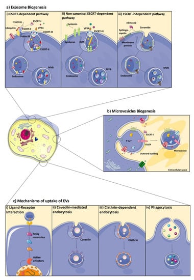 Extracellular vesicles formation: (a) exosome biogenesis. (i) the ESCRT-dependent pathway. In the canonical ESCRT-dependent pathway, phosphatidylinositol-3-phosphate (PtdIns3P) recruits the ESCRT-0 (STAM1, HRS) to the endosomal membrane by ubiquitinated proteins and is subsequently clustered into microdomains via clathrin binding. Then, the ESCRT-0 recruits ESCRT-I (TSG101, VPS28, VPS37A-D, MVB12A-B, UBAP1), via the direct interaction of HRS with the TGS101 subunit of ESCRT-I. Moreover, ESCRT-I also interacts with the ESCRT-II complex (EAP30, EAP20, EAP45); this interaction is thought to be responsible for membrane deformation into buds. The last complex that interacts with the ESCRT-II is the ESCRT-III (CHMP2-7, CHMP 1A-B), which is required for ILV scission into the MVB lumen and disassembled after ILV scission via AAA-ATPase Vps4 []; (ii) Non-canonical ESCRT-dependent pathways. Syndecan-syntenin-ALIX pathway. The transmembrane protein syndecan recruits syntenin, which interacts with ALIX. This protein recruits ESCRT-III for membrane budding and cargo sorting, and VPS4 for the scission step, which occur independently of ubiquitin and ESCRT-0; (iii) ESCRT-independent pathway. The neutral type II sphingomyelinase family (nSmase2) converts sphingolipids to ceramides, which can induce lipid curvature and trigger the conversion of ILVs into MVBs []. (b) Microvesicles Biogenesis. The mechanisms underlying MVs biogenesis are still being revealed: it has been observed that ESCRT molecules could promote their formation; calcium, ATP and lipid-mediated mechanisms can also induce the production and release of MVs. (c) Mechanisms of uptake of EVs. (i) Ligand–receptor interaction. In the immunomodulation, the EVs derived from cancer cells carry programmed death ligand-1 (PD-L1) at the surface, by which they bind the programmed cell death protein-1 (PD-1) and lead to cancer immune evasion []. Mechanisms that involve the cellular internalization pathways and the membrane fusion; (ii) Caveolin-mediated endocytosis; (iii) Clathrin-dependent endocytosis; (iv) Phagocytosis. Made using cliparts from Servier Medical Art by Servier, https://smart.servier.com.