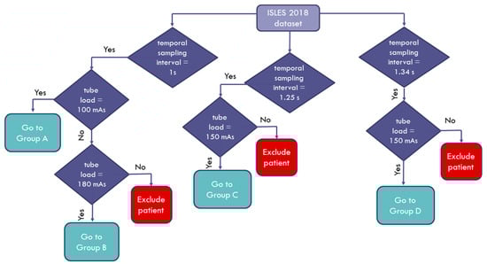 The data used in this study were a subset of the 2018 Ischemic Stroke Lesion Segmentation (ISLES) challenge dataset (www.isles-challenge.org, accessed on 17 June 2021) [,,] from four clinical sites. The cohort consisted of 103 acute stroke patients who presented within eight hours of stroke onset. All patients underwent diffusion MRI within an interval of three hours after CTP examination. The image data for each patient were provided with the corresponding quantitative perfusion maps for cerebral blood flow (CBF), cerebral blood volume (CBV), mean transit time (MTT), and time to maximum enhancement (TMAX), with a matrix size of 256 × 256. The provided image data were also motion-corrected. We studied a 90-patient subset that had high frame rate acquisitions (1–1.34 s). The studied cohort was divided into four groups according to the specific acquisition protocol and scanner vendor, as shown in Table 1. Furthermore, a flowchart depicting how the patients enrolled in this study is shown in Figure 1 below.