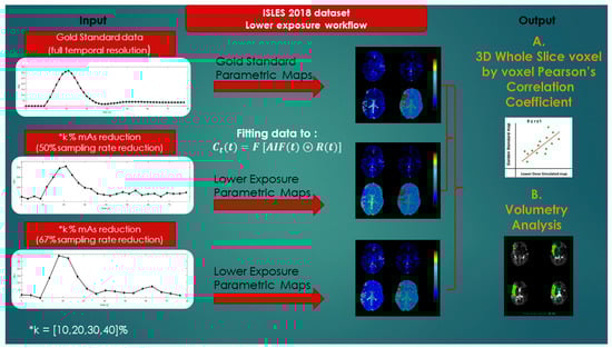 The main goal of this study was to investigate the diagnostic value of lower-exposure protocols through the joint effect of simulating the tube current time product reduction and increasing the image sampling interval. The CTP image data for each patient as derived from the ISLES database were used to produce eight corresponding simulated image datasets, assuming 10%, 20%, 30%, and 40% reduced exposure (mAs) in combination with doubling and tripling of the temporal sampling interval. The overall workflow for the study is depicted in Figure 2.