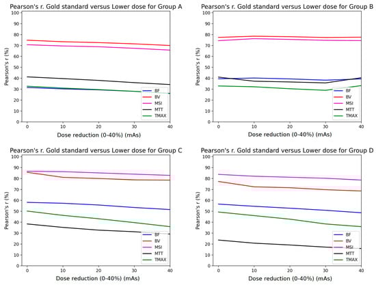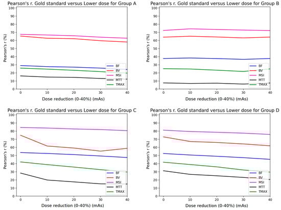 The Pearson analysis results are summarized in Figure 4 and Figure 5. The mean Pearson’s correlation coefficient r is presented for each of the four subgroups of the studied cohort. The r is plotted as a function of the % mAs reduction for every map produced from CTP acquisitions involving temporal resolution reduced by 50% (Figure 4) and 67% (Figure 5). The p-values for all calculated r values were found to be <10−3 because of the large number of the voxels involved in the estimation of r.