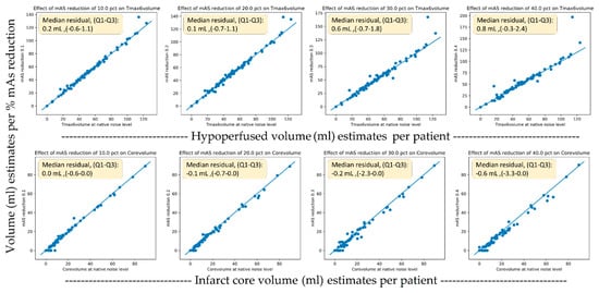The TMAX lesion volumes of the original scans had a median of 48 mL (IQR, 31–65). The core lesion volumes had a median of 8 mL (IQR, 0–21). Figure 6 shows scatter plots of the original versus dose reduction volumes for infarct core and hypoperfusion volume estimates. Similarly, Figure 7 presents the scatter plots for sampling rate reductions. Table 3 tabulates the results expressed as lesion volume differences to the original scan for each dose reduction level.