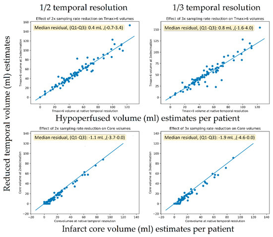 Scatter plots of the original versus temporal reduced volumes for infarct core (lower row) and hypoperfusion (upper row) volume estimates.