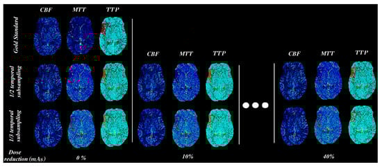 - Wiesmann, M.; Berg, S.; Bohner, G.; Klingebiel, R.; Schöpf, V.; Stoeckelhuber, B.M.; Yousry, I.; Linn, J.; Missler, U. Dose reduction in dynamic perfusion CT of the brain: Effects of the scan frequency on measurements of cerebral blood flow, cerebral blood volume, and mean transit time. Eur. Radiol. 2008, 18, 2967–2974. [Google Scholar] [CrossRef] [PubMed]