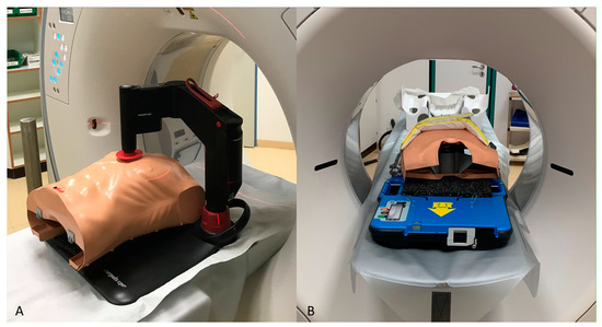 Setup of the phantom examinations using corpuls cpr (A) and AutoPulse (B).