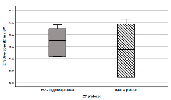 The two investigated CT examination protocols differed in radiation dose, but the difference was not statistically significant (p = 0.946). The mean effective dose applied with the clinical trauma protocol during automated chest compression was 14.76 mSv (868.15 mGy·cm; minimum of 12.32 mSv, maximum of 17.28 mSv) versus 15.51 mSv (912.30 mGy·cm; minimum of 14.16 mSv, maximum of 16.81 mSv) with the protocol using ECG triggering. This corresponded with a 5.09% increase in radiation dose with the triggered protocol (Figure 3).