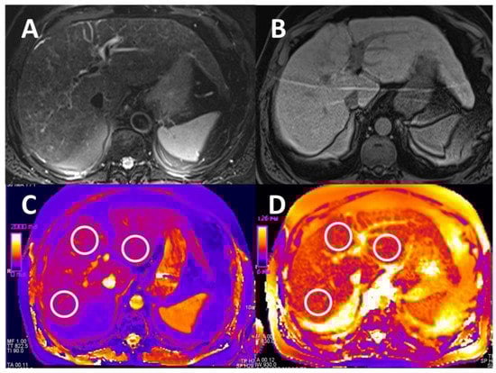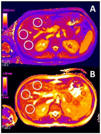 Extensively studied and successfully applied in the field of cardiac diseases, MR relaxometry shows a growing contribution to liver imaging: T1 mapping combined with the liver-specific contrast agent gadoxetate disodium was proven useful to stage liver function in patients, as hepatocellular uptake of gadoxetate disodium into liver cells correlates with clinical liver function tests [1,2,3,4]. Native T1 relaxation times of the liver have, so far, not been studied extensively, and studies are limited to either patients with liver fibrosis or classifications according to the Child–Pugh score [1,5,6,7,8]. Equally, up to now, only very few and mainly preclinical studies evaluating T2 values have been published regarding the liver [9,10], with even fewer clinical approaches [11].