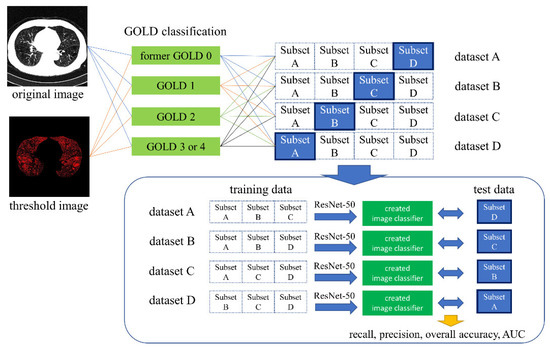 Recently, the deep learning application in medical imaging has been actively promoted, and in the field of medicine, it has been widely used for image classification [20,21,22,23], object detection [24,25,26], semantic segmentation [27,28,29,30], and so on and has been widely applied from disease classification to detection. Deep learning has been reported for the automatic classification of emphysema patterns in CT images [31], but CT images were used as a simple input without any preprocessing. In image classification using convolutional neural networks (CNNs), features are extracted from the entire image and classified, but whether it is sufficient to simply input the entire image or whether preprocessing is required to set up a supervised image has not been sufficiently investigated. Additionally, there has been no attempt to classify the spirometric severity of COPD using CT images based on the diagnosis results of pulmonary function tests using image classification technology of artificial intelligence. This study aimed to create a classifier trained with and without preprocessing to detect the groups that require therapeutic intervention using CT images and to evaluate the recall, precision, overall accuracy, and AUC of different spirometric classifications using confusion matrix.