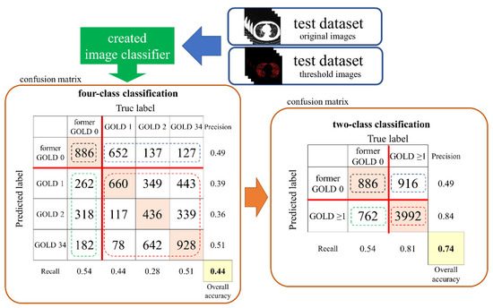 The software for the deep learning technique was developed with in-house MATLAB software (The MathWorks, Inc., Natick, MA, USA) and the use of a desktop computer with an NVIDIA RTX 1080Ti or RTX 2080Ti graphics card (Nvidia Corporation, Santa Clara, CA, USA). ResNet50 was used as the CNN, and the hyperparameters were set to epoch 10 and base learning rate 0.0001. The training dataset consisting of each subset was used for data augmentation, and the images were rotated from −25 degrees to 25 degrees. To create four classifiers for both the original image and the threshold image, we trained each of these images. The classifiers were tested with test data for each dataset, and the results of classification into former GOLD 0, GOLD 1, GOLD 2, and GOLD 3 or 4 were combined into a confusion matrix to obtain the recall, precision, overall accuracy, and AUC (Figure 1). The confusion matrix was further divided into two classes, former GOLD 0 and GOLD ≥ 1, and recall, precision, overall accuracy, and AUC were calculated for each class (Figure 2). The training was performed twice using RTX 1080Ti and RTX 2080Ti GPUs.