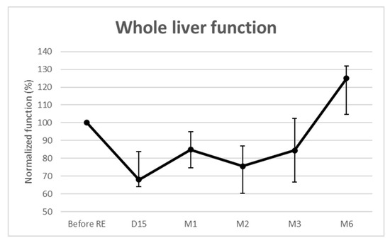 Whole liver function significantly decreased over time (Figure 2). The median loss was maximal at 2 weeks (−32% (IQR: −36–−16.2%; p = 0.002)) and remained below baseline until month 3. It was then −15% (p = 0.002) at 1 month, −25% (p < 0.001) at 2 months, and −16% (p = 0.027) at 3 months. For the 3 patients evaluated at 6 months, the median whole liver function increased by 25% (IQR: 4.8–31.9%; p = 0.159). No REILD [10] was observed.