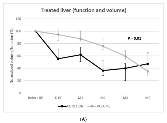 Function of the treated livers rapidly and strongly decreased to reach −64% (IQR = −80–−59%; p < 0.001) at 2 months and −60% (IQR = −80–−52%; p < 0.001) at 3 months (Figure 3). Volumetric and functional changes exhibited parallel (i.e., dependent) evolutions (p = 0.01) with linear mixed models. Nevertheless, volumetric loss underestimated functional loss until 6 months post-RE.