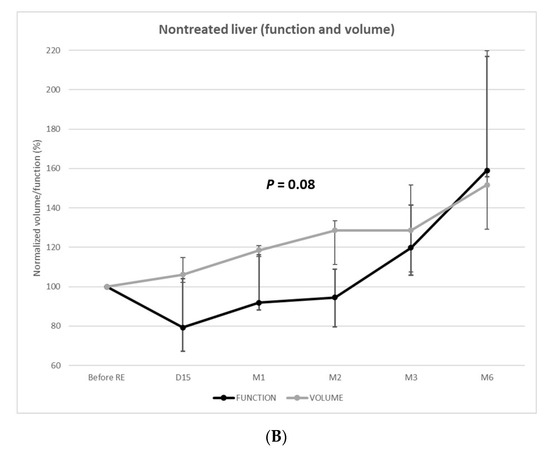 Over time, the volume and function of the nontreated livers varied independently (p = 0.08). The volume progressively increased, whereas function remained below the baseline level until 3 months post-RE.