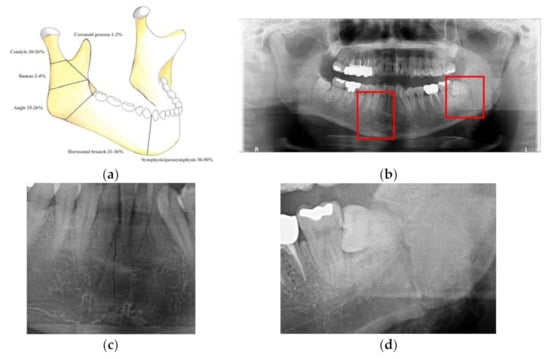 Examples of mandibular fracture: (a) anatomic area of mandibular fracture [2], (b) mandibular fractures (red boxes) in panoramic radiographs, (c) linear fracture on parasymphysis area, and (d) shear fracture on angle area.
