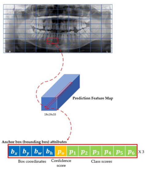 where is the number of grid cells, is the number of the bounding boxes (or anchor boxes), and is the number of class scores. The confidence score depends on whether the object exists inside the bounding box.
