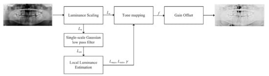 However, the gamma modulation module tends to detect normal regions that do not have fractures. Thus, we additionally applied luminance adaptation transforms to the gamma shifted training dataset. There are two types of the luminance adaptation transform, SLAT and MLAT [18]. SLAT has two main processes, local tone mapping in the luminance channel and chrominance compensation in the chrominance channel. Since the panoramic radiographs are only grayscale images, only the local tone mapping of the luminance channel is considered in the SLAT process. As the second step for luminance augmentation, the luminance adaptation transform (LAT) process is shown in Figure 9. The SLAT adjusts visually compensated gamma values according to local adaptation luminance level. The luminance level is divided into minimum luminance level and maximum luminance level.