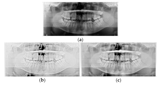 The comparison between original panoramic radiograph, single-scale luminance adaptation transform (SLAT), and multi-scale luminance adaptation transform (MLAT) panoramic radiograph: (a) Original, (b) SLAT, and (c) MLAT.
