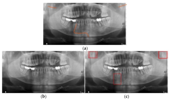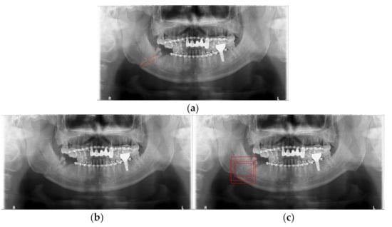 Another medical diagnosis based on YOLO is by Yang et al. They presented an automated detection of cyst and tumor of the jaw in panoramic radiographs [12]. Note that the odontogenic tumors and cysts are ambiguous radiological features because they do not reveal their characteristic until they reach a certain size. However, they trained many data of the cyst and tumors of the jaw to overcome its flaws. They also tried the YOLO’s localization objects correctness. Odontogenic cysts and tumors appear in various features and borders in panoramic radiographs, as shown in green boxes in Figure 3. Therefore, it is difficult to recognize it in YOLO. Moreover, feature maps of cysts and tumors in YOLO have become too obscure to set the bounding boxes, which may have contributed to the significant false negative (undiagnosed) rate of cysts and tumors.