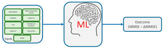 To analyze the neuro-cognitive functions of the patients examined, we used the Mini-Mental State Exam (MMSE), a 30-question assessment of cognitive functioning that evaluates attention, orientation, memory, registration, recall, calculation, language and ability to draw a complex polygon [21,22]. The test consists of 11 items divided into 5 sections, its total score ranging from 0 to 30. The threshold score for “normality” is set at 24/30; however, this limit is influenced by age and education, for which correction factors have been developed [21,22]. The present study took into consideration the MMSE calculated at the first visit (MMSE1) and at the last visit (MMSE2) performed up to the year 2020. The average elapsed time between the first and the last test is 1427 days (equal to 3.9 years). A Machine Learning (ML) approach was employed to assess which of the parameters (haemoglobin, Mean Corpuscular Volume, platelets, creatinine, TSH, parathyroid hormone (PTH), vitamin B12, VD and FA) drawn from the patients were most predictive of their cognitive involvement concerned with AD (Figure 1).