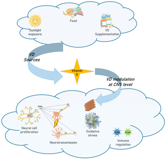 Vitamin D (VD) is a secosteroid hormone with two forms, D2 (ergo-calciferol) and D3 (cholecalciferol). The active form, 1,25-hydroxyvitamin D, also known as calcitriol, primarily regulates the homeostasis of calcium and phosphate [1,2]. According to the scientific literature, it is now well established that VD, through VD receptor (VDR) and micronutrients, including folic acid (FA), are able to modulate both the innate and the adaptive immune responses [1,2,3]. Low VD and FA levels appear to promote cognitive decline in several neurodegenerative conditions, as in Alzheimer’s disease (AD) [4,5]. Indeed, low levels of VD were found in several neurological and neuropsychiatric conditions, including those whose onset occurs during childhood, including Autism Spectrum Disorders (ASD) [6]. Low VD levels also occur in typical disorders of the older age, such as neurodegenerative processes [4]. On the other hand, VD supplementation is eventually associated with a significant cognitive function improvement in early dementias, as occurs in the case of the Mild Cognitive Impairment (MCI) [7]. Indeed, the role of VD at brain level is manifold. It is well known that VD is somewhat involved in the processes dealing with synaptic plasticity, notably in long-term potentiation, pivotal in storing information at brain level. Overall, synaptic plasticity refers to the ability to generate new synapses, eliminate existing ones, and alter the electrophysiological, molecular, and structural properties of existing synapses in response to experience [8]. As such, synaptic plasticity is key to learning and memory among other cognitive processes [9].