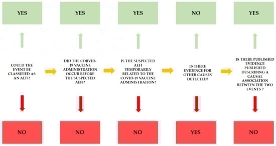 Following the checklist step-by-step, it is possible to collect specific information in order to define causality between vaccination and severe adverse effects. As previously described, it is necessary to answer five questions, considering the first question a pre-requisite: the identification of an AEFI following administration of a COVID-19 vaccine is necessary to proceed with the causality assessment algorithm. As reported in Figure 2, the green answer reinforces the causality association between the two events, whereas the red answer implies poor causal association.