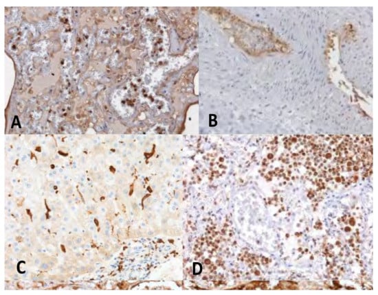 - Facchetti, F.; Bugatti, M.; Drera, E.; Tripodo, C.; Sartori, E.; Cancila, V.; Papaccio, M.; Castellani, R.; Casola, S.; Boniotti, M.B.; et al. SARS-CoV2 vertical transmission with adverse effects on the newborn revealed through integrated immunohistochemical, electron microscopy and molecular analyses of Placenta. EBioMedicine 2020, 59, 102951. [Google Scholar] [CrossRef] [PubMed]