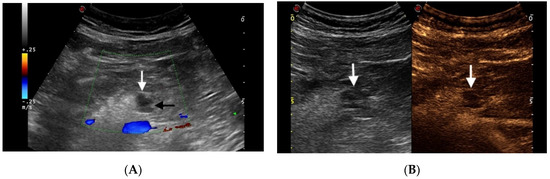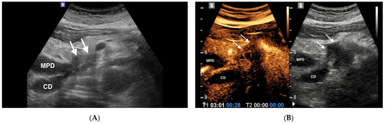 Chronic pancreatitis (CP) is characterized by fibrosis, destruction and distortion of the pancreatic ducts with loss of parenchyma. The most important diagnostic sign of chronic pancreatitis is the presence of calcifications and the dilatation (more than 3 mm) or irregular course of the pancreatic duct [53,54]. During the evolution of CP, inflammatory masses can appear, a characteristic feature of pseudo-tumoral CP. Differential diagnosis between this entity and pancreatic cancer is often difficult due to the similar imaging aspect: they, indeed, are both hypoechoic in conventional US [55]. CEUS can improve the differential diagnosis between pseudo-tumoral CP and pancreatic adenocarcinoma. D’Onofrio et al. showed the hypoecho-genicity of ductal adenocarcinoma in all contrast-enhanced phases, due to its intense desmoplastic reaction with poor mean vascular density of the lesion, contrary to the enhancement in the early contrast-enhanced phase characteristic of the inflammatory mass (Figure 4) [56].