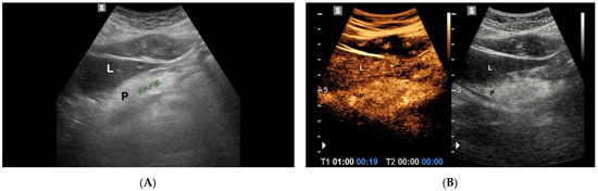 Focal autoimmune pancreatitis. (A) B mode Ultrasonography shows a 1.2 cm hypoechoic lesion (calipers) in the pancreatic body; (L: liver; P: Pancreas). (B) On CEUS, in the arterial phase (19 s after the injection of c.a.), the lesion is isoechoic in comparison with the adjacent pancreatic parenchyma.
