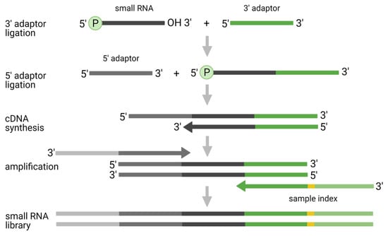 The traditional two-adaptor ligation approach utilizes the ligation of the pre-adenylated 3′-end adaptor followed by the ligation of the 5′-end adaptor (Figure 1). Although this approach has been successfully applied in the majority of small RNA-seq studies (for historical reasons), its application is associated with several issues, including: (i) ligation bias; (ii) preferences to certain small RNA classes; and (iii) formation of adaptor dimers.