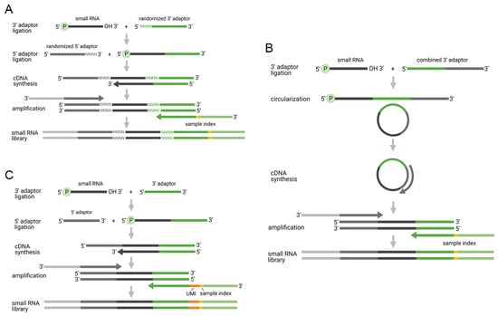 The improved two-adaptor ligation approaches aim to prevent or mitigate the ligation or PCR bias. Currently, there are three approaches available: (i) ligation of two adaptors with randomized nucleotides (Figure 2A); (ii) ligation of single adaptor and subsequent circularization (Figure 2B); and (iii) ligation of two adaptors with UMIs (Figure 2C).
