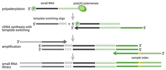 Polyadenylation and template switching mechanism applied in small RNA-seq analysis.