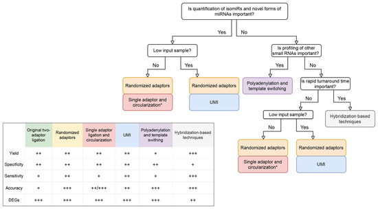 (i) First, the choice of a protocol is given by the molecule of interest. miRNAs are enriched in the majority of ligation-based protocols, whereas other small RNAs along with miRNAs are captured by polyadenylation methods. As polyadenylation suffers from a low mapping rate and inability to distinguish isomiRs, protocol adjustments (specialized enzymes, ligation of cDNA) might be applied in the ligation-based protocols to capture also other small RNA classes [49,80].