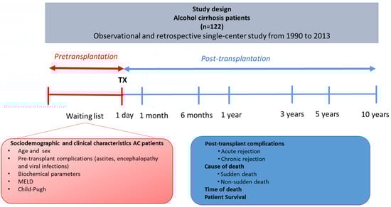 A cohort of 122 consecutive Caucasian AC patients undergoing LT at the University Clinic Hospital ‘Virgen de la Arrixaca’ in the Murcia Region (Spain) from 1990 to 2013 was retrospectively reviewed. In this observational and retrospective single-center study. The median age was 53.1 ± 8.9 (mean years ± SD) in this cohort. Figure 1 shows a diagram of the design and the different variables considered in this study.