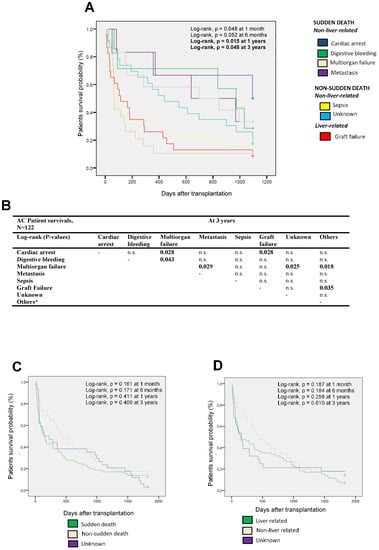 Subsequently, the different survival of the AC patients was compared according to the different causes of death (Figure 2A), only observing statistically significant differences at 1 and 3 years post-transplantation (log-rank, p = 0.015 and p = 0.048, respectively).