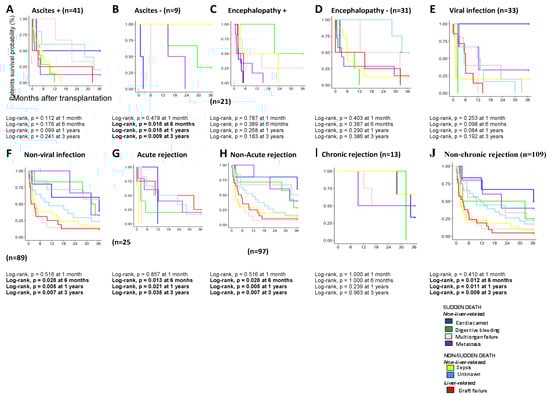 The presence of pre-transplant complications (ascites or encephalopathy), pre-transplantation viral infections, and the presence of graft rejection do not seem to significantly influence survival according to the different causes of death in the short- or long-term (Figure 3A,C,E,G,I).